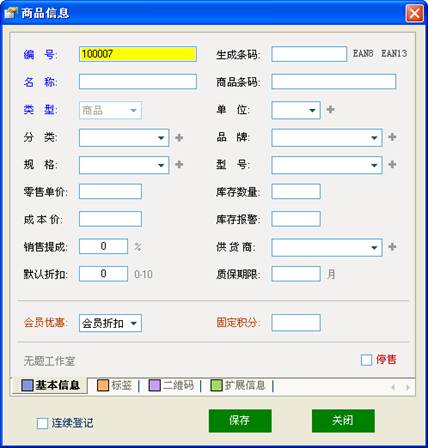 商品编号:是按软件中系统设置中对商品编号设置的格式自动生成,如果不想用这个编号可以删除重新填写