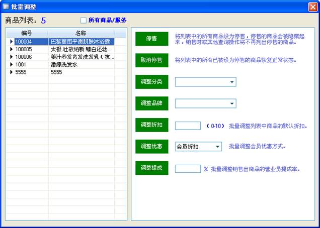可以在列表中选择多个商品或是所有商品,进行批量设置,可以设置销售状态,调整分类和口牌,调整折扣或是优惠方式,调整提成比率。极大的方便对商品的修改。