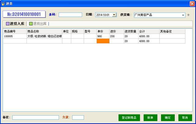 使用进货/退货命令,可以对已有的商品库存进行调整,在商品管理中查询商品的现有库存,在此做相应的进货和退货操作,方便后期的售销管理。从上图中选择“进货入库”或是“退货出库”在下方列表中择对应的商品,输入价格和数量,确定就可以了。