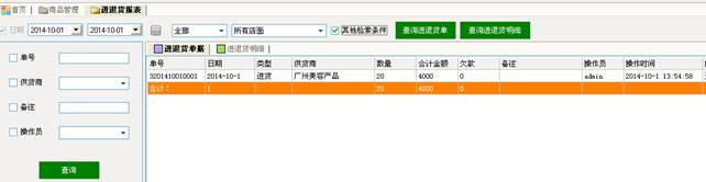 查示和查看指定日期范围内的进退货的统计表和明细表,可以勾选“其他检索条件”来显示左边的条件选项,复合查询指定的进退货单据。