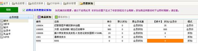 此功能极大了扩充了会员类型对不同商品和服务折扣和价格的设置,在左边显示本软件中已存在的会员类型,右边显示的是已存在的商品和服务,我们可以在左边选择会员类型,然后在右边选择商品或服务对应的优惠模式(会员价/折扣)然后输入新的会员价或是折扣),在收银结算是,就忽略会员类型原有的价格和折扣,依照类型折扣中新设置的参数计算执行。