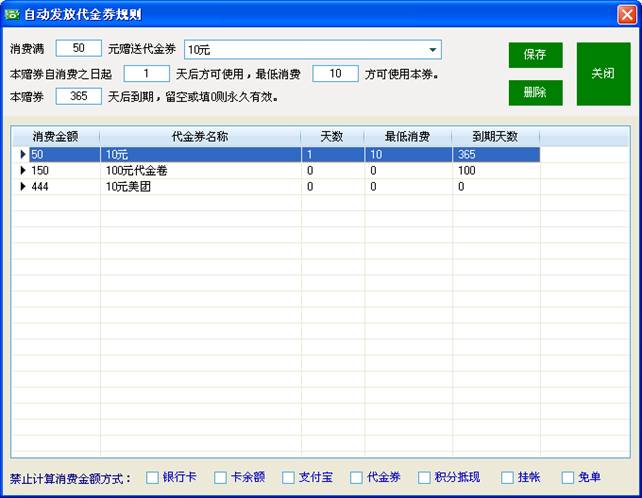 为了给顾客一个优惠或是绑定顾客,能让顾客下一次再来消费,我们可以给顾客发放代金券,本软件可以手动和自动给顾客发放代金券。